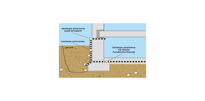 - izolacja typu lekkiego (przeciwwilgociowa) - wykonuje się ją w przypadku posadowienia budynku powyżej poziomu wody gruntowej w gruntach przepuszczalnych (piaskach i żwirach),